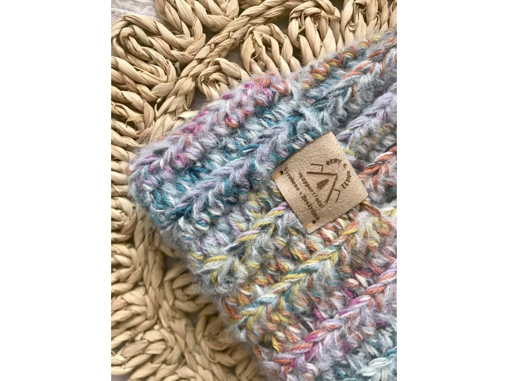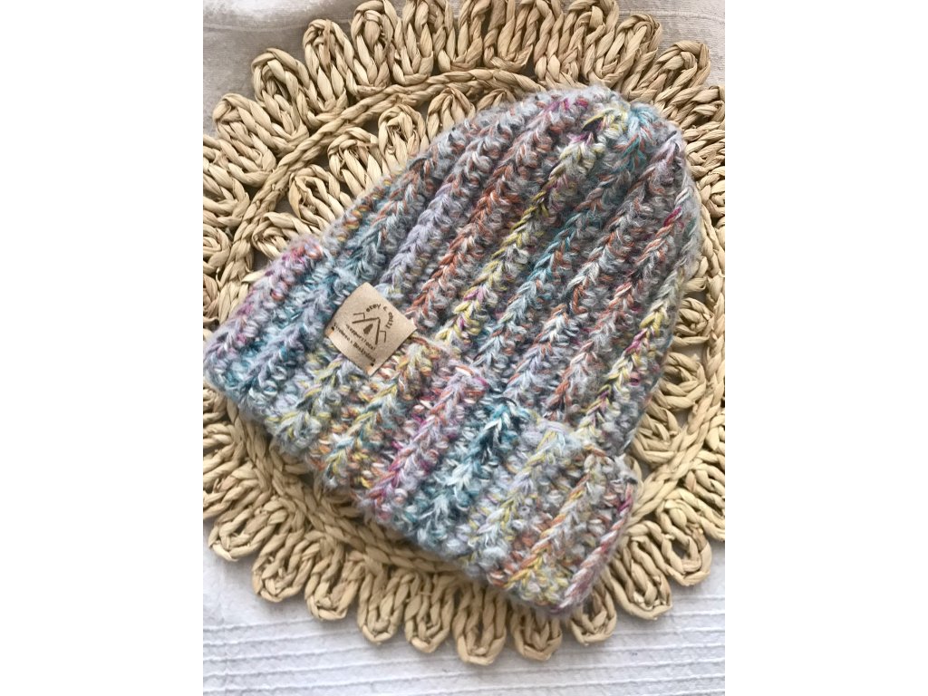 Ručně háčkovaná čepice v kouzelné barvě Jednorožec. Vyrobena z příze Fabel, doplněná o přízi z mohéru (70 % vlna, 20 % polyamid, 10% mohér) – hřejivá, odolná a snadno pratelná.
