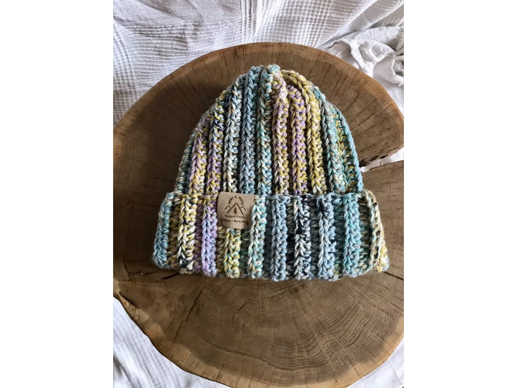 Ručně háčkovaná čepice v kouzelné barvě Jednorožec. Vyrobena z příze Fabel (75 % vlna, 25 % polyamid) – hřejivá, odolná a snadno pratelná.