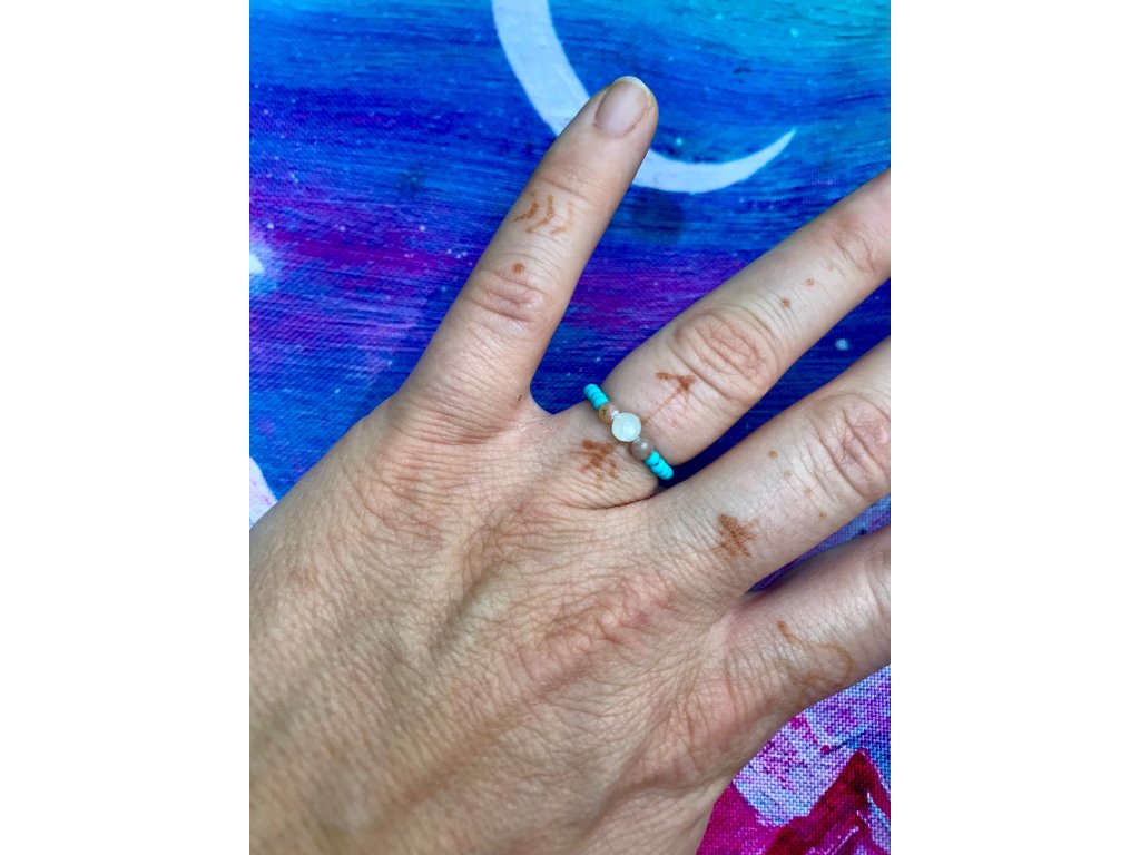 Ručně vyrobený prstýnek s modrým rokajlem, morganitem a dvěma rutilovými křemeny. Šperk, který propojuje hloubku a světlo. Univerzální velikost.