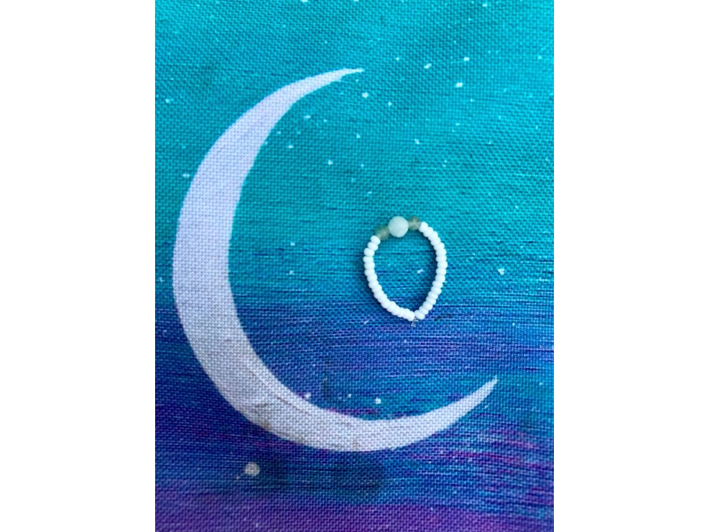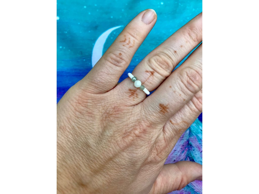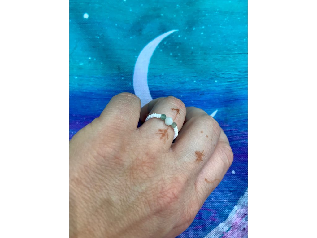 „Jemnost bytí“ je lehounký a čistý prstýnek vytvořený z bílého rokajlu, dvou amazonitů a středového korálku z morganitu. Navlečený na pružném materiálu, krásně se přizpůsobí prstu a je ideální na každodenní nošení i jako vědomý doplněk.