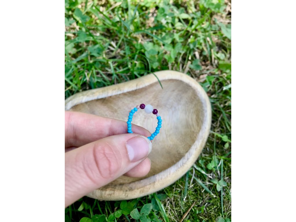 Jemný prstýnek na pružné šňůrce z tyrkysového rokajlu, doplněný rubíny a měsíčním kamenem. Univerzální velikost. Ručně vyrobený talisman ženské síly.