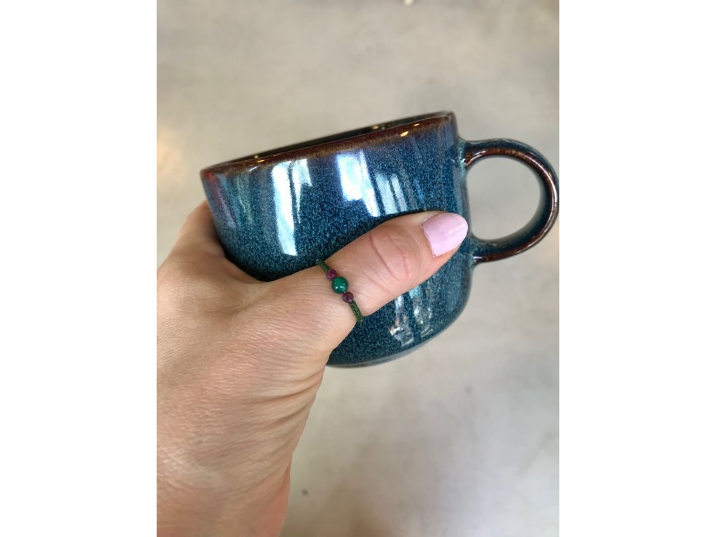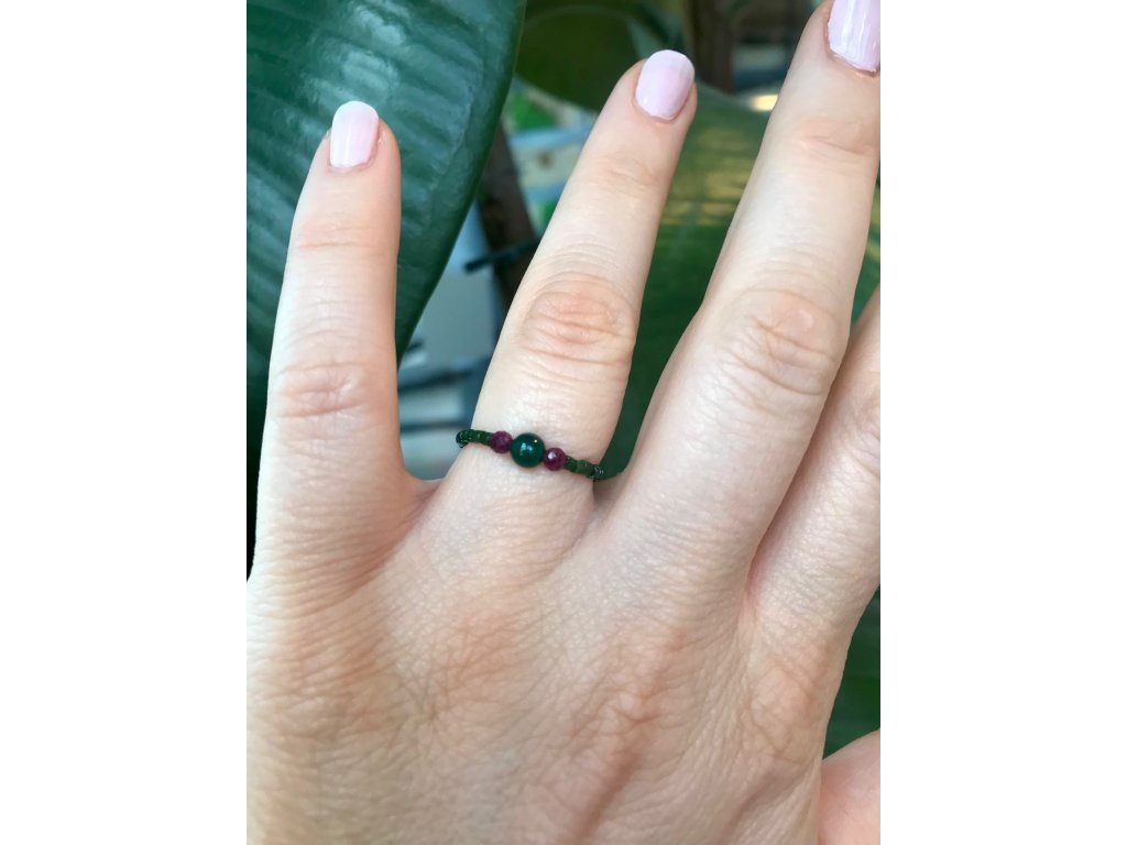 „Mech a oheň“ je ručně vyrobený prstýnek, který propojuje hluboký klid se žhavou vnitřní silou. Tmavě zelený rokajl Miyuki připomíná mechový koberec v tichém lese – pevný, uzemňující.